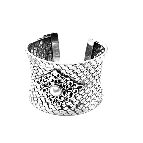 Sterling Silver Handwoven Cuff set with Pearl and decorated filigree