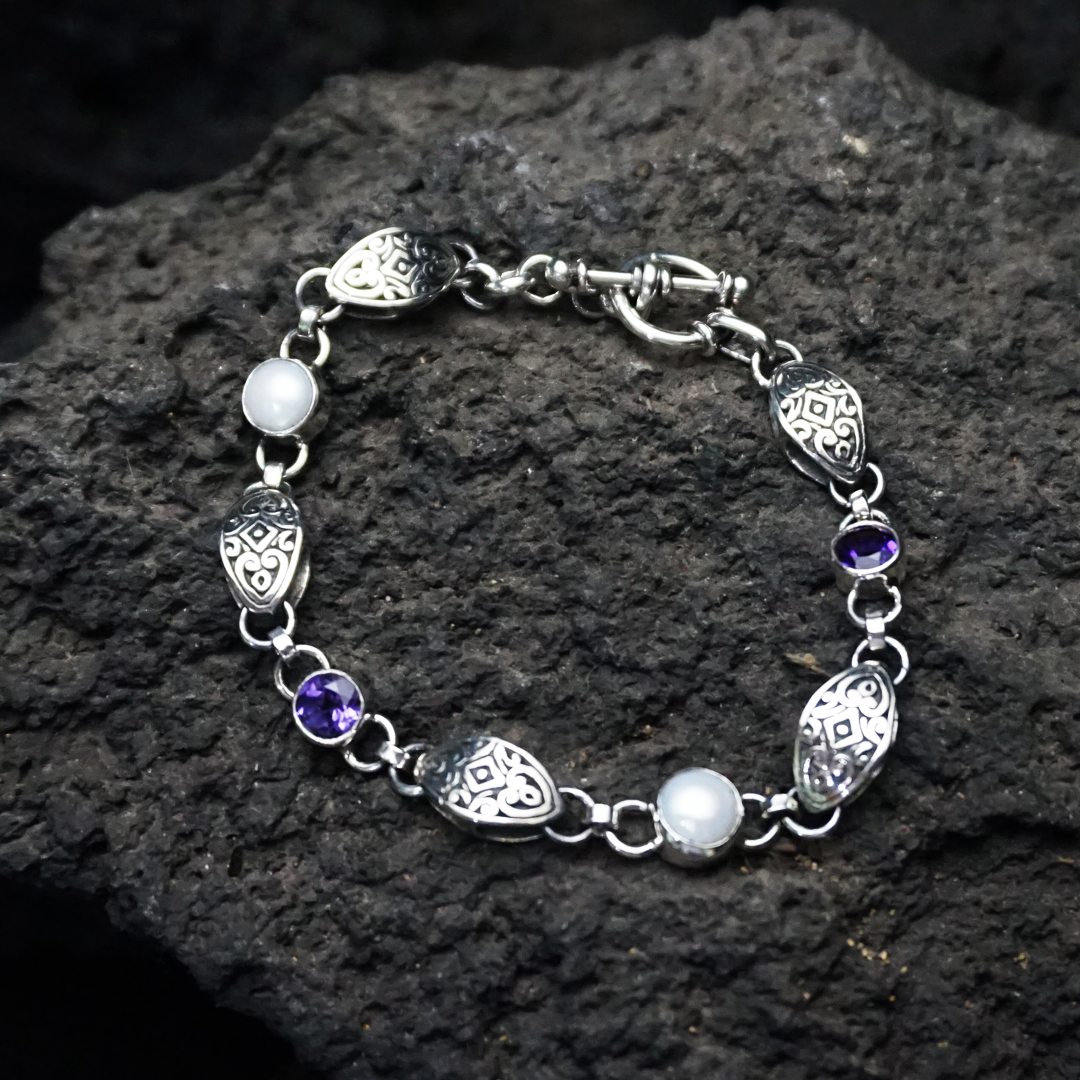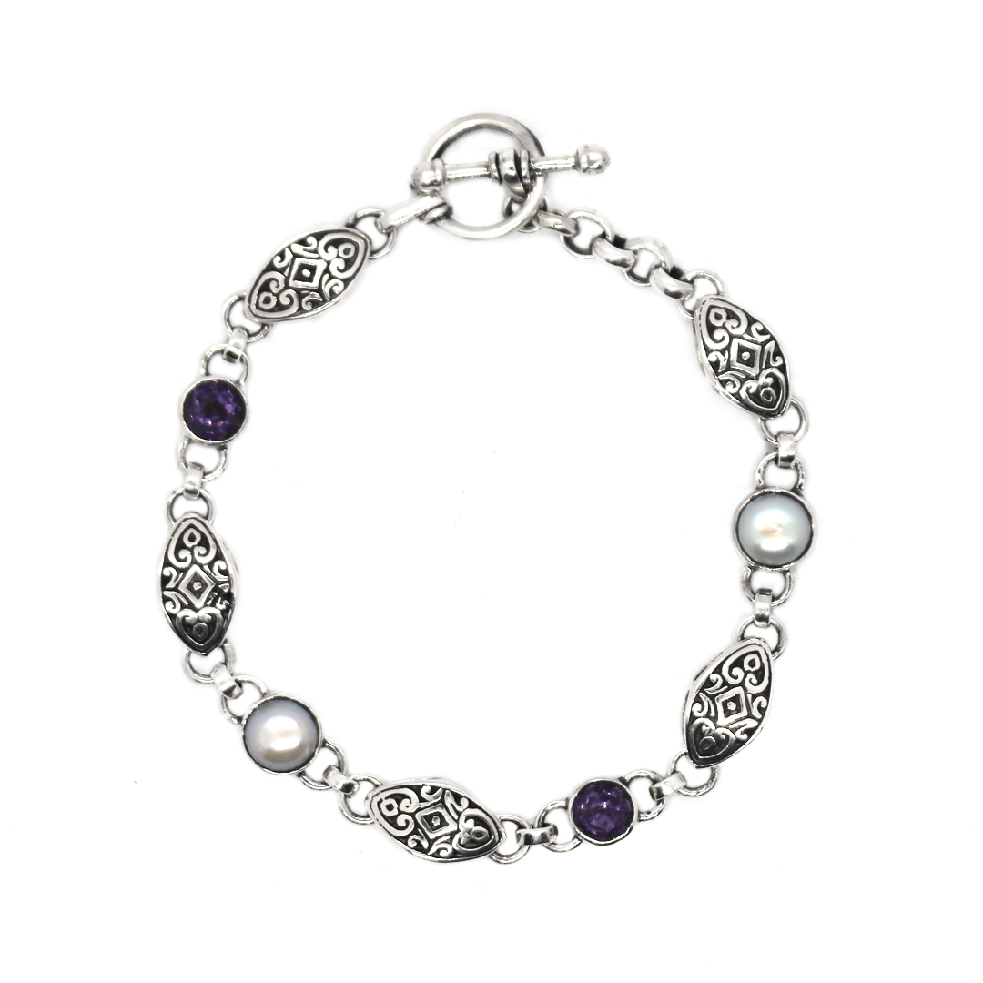 Sterling Silver Bracelet Filigree with Amethyst Stone & Fresh Water Pearl